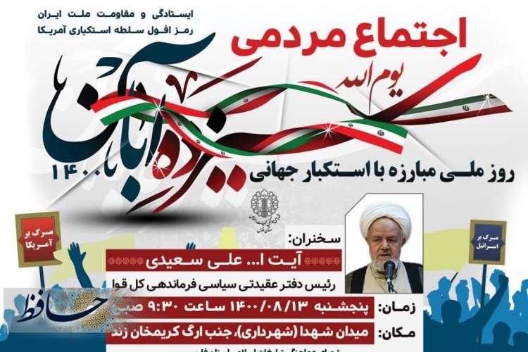 حجه الاسلام و المسلمين رضائي گفت: بنا به برنامه ريزي هاي صورت گرفته در اين خصوص، مراسم بزرگداشت سيزدهم آبان در شيراز از ساعت 9:30 صبح روز پنج شنبه 13/08/1400 با حضور اقشار مختلف مردم در محل ميدان شهداي شيراز، جنب ارگ كريم خان زند با ويژه برنامه هاي خاصي نظير: اجراي گروه سرود دانش آموزي، قرائت قطعنامه و ايراد سخنراني توسط حضرت آيت الله سعيدي، رئيس عقيدتي سياسي فرماندهي معظم كل قوا در ستاد كل نيروهاي مسلح برگزار می گردد.
